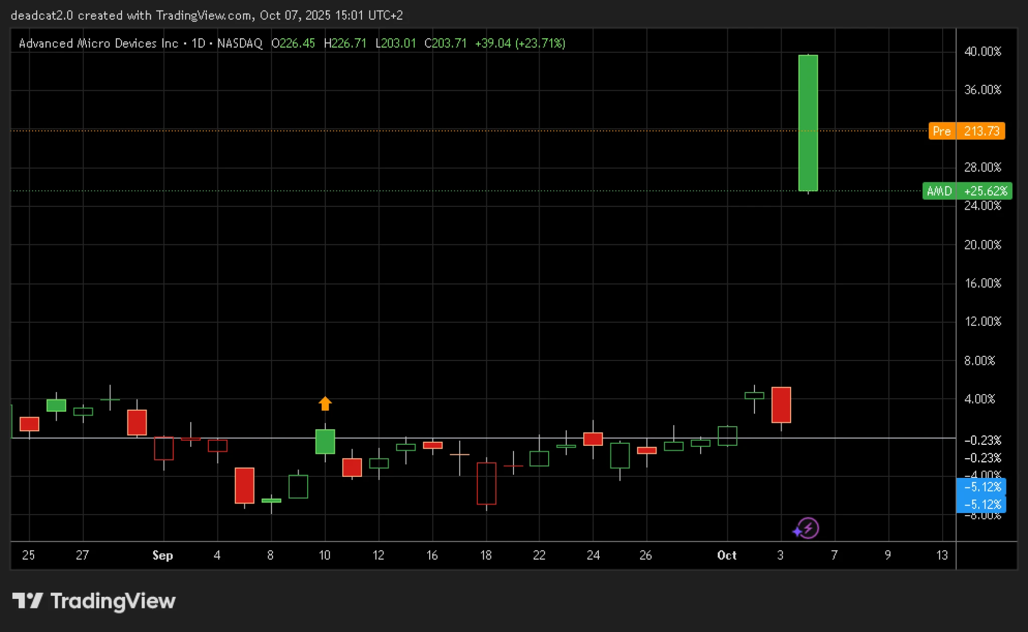 Jako nejnovější příklad můžeme uvést akcie americké společnosti Advanced Micro Devices (AMD), jež patří mezi největší světové designéry a výrobce mikročipů. Cenné papíry této firmy v pondělí vyletěly o 24 procent poté, co AMD oznámila dohodu o dodávce datového výpočetního výkonu, respektive čipů, o kapacitě šest gigawattů právě pro OpenAI.