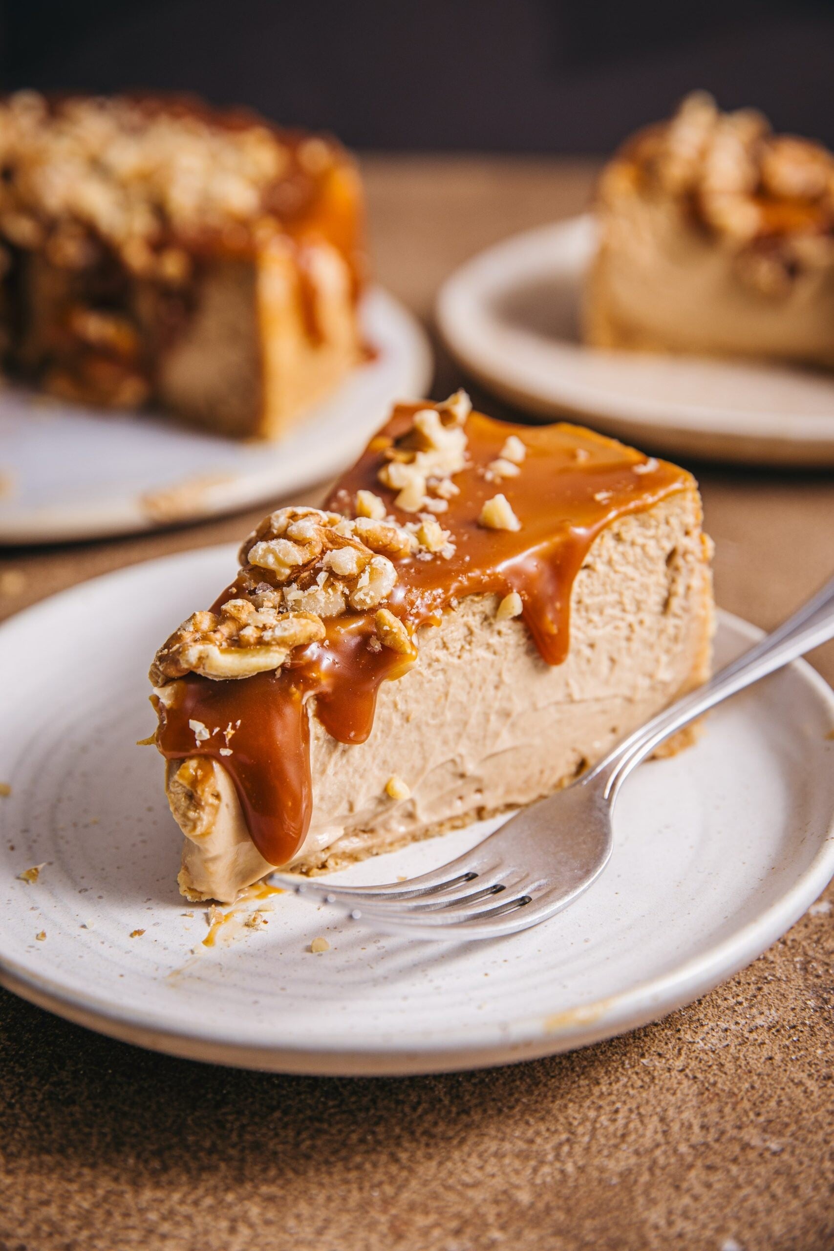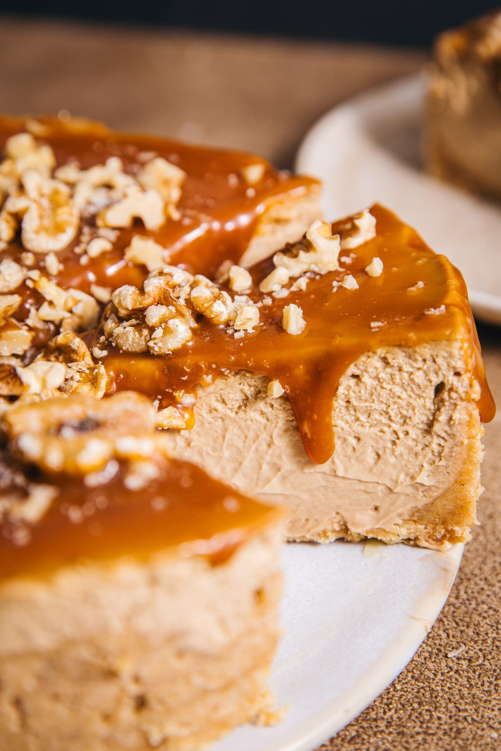 Instantní káva v cheesecaku zní jako zkratka, v tomto receptu jde ale o záměr. Dodává krémovému základu hloubku a intenzitu, které by čerstvá káva dosáhla jen těžko – a v kombinaci s karamelem uvnitř i nahoře a vlašskými ořechy přidávajícími křupavou zemitou texturu vytvoří dezert, který je opravdu výjimečně dobrý.