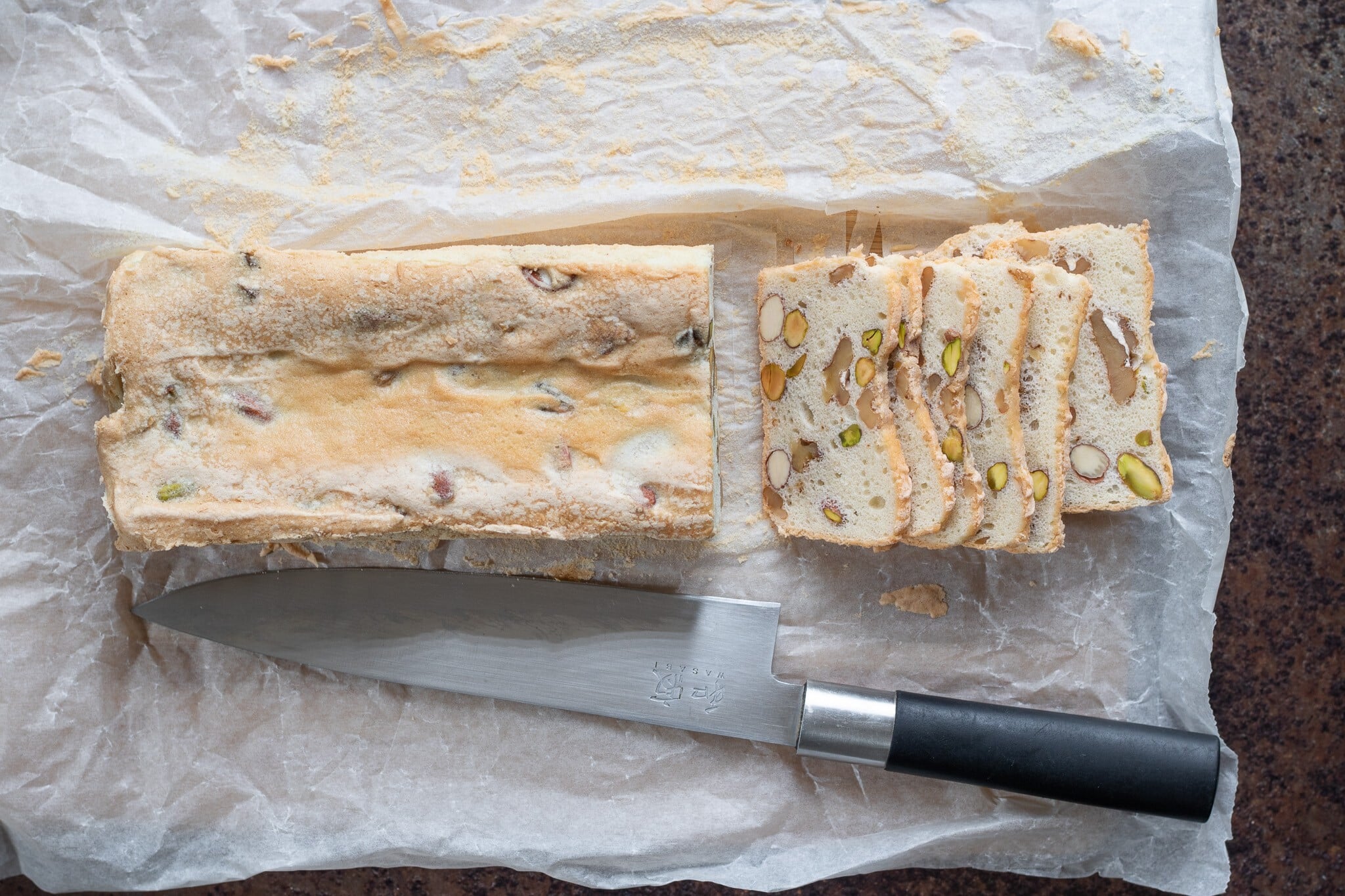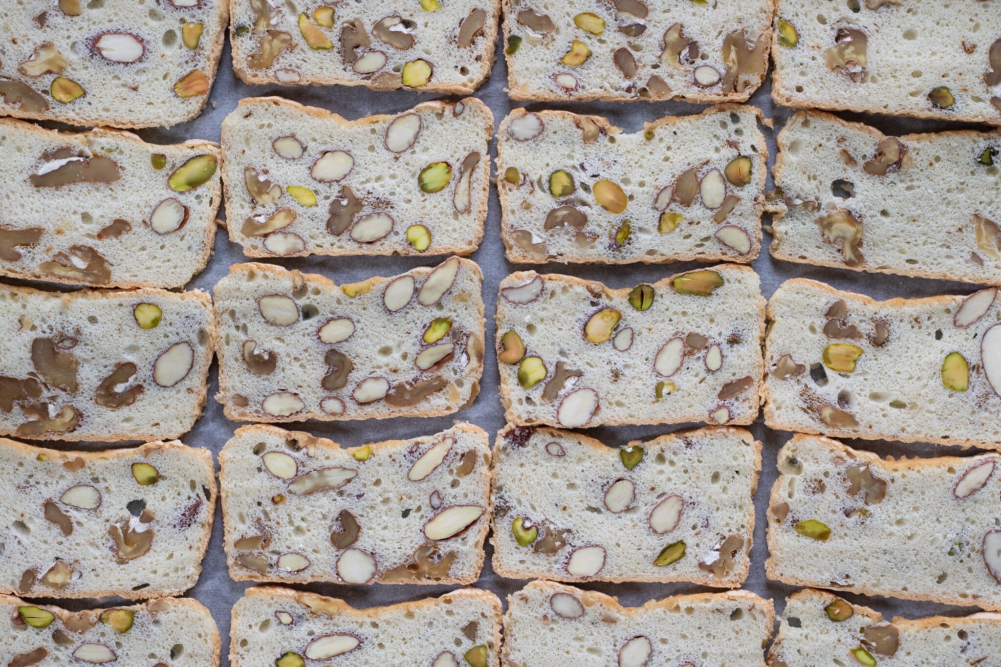 - Po odležení rozbalte chlebíček ze sáčku i z papíru a nakrájejte ostrým nožem na tenké, 2 až 3 mm silné plátky. Rozprostřete je na plech vyložený pečicím papírem a při 120 °C v režimu horkovzduch pečte 30 minut. Nechte na plechu zchladnout.