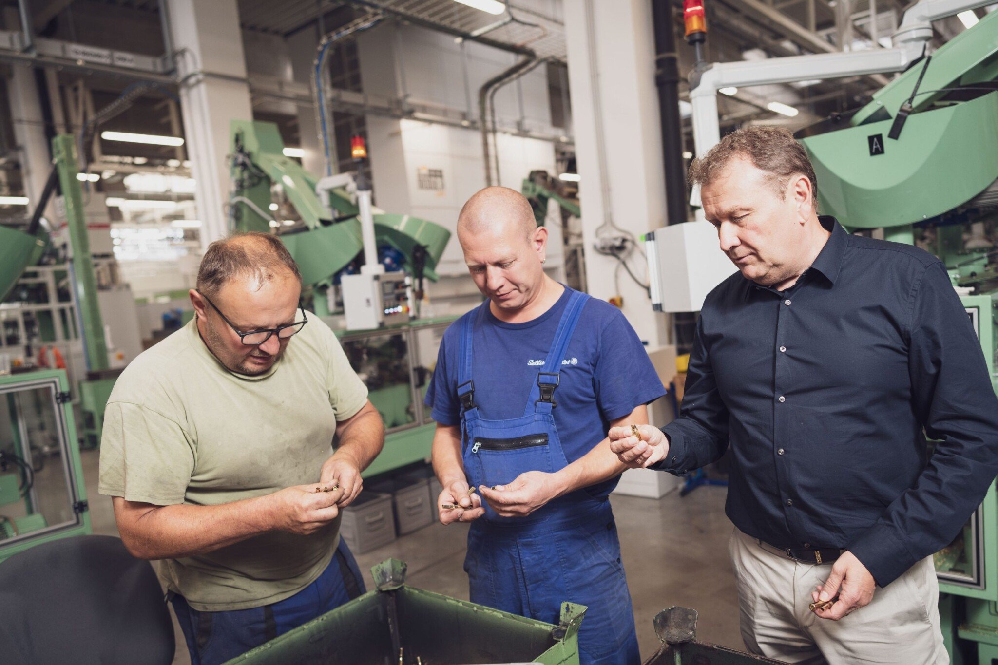 Je cítit, že tu doma skutečně je. Výrobními halami, kde po pásech jezdí jedna nábojnice za druhou, se pohybuje s takovou samozřejmostí, že místy snad zapomene, že za ním kráčí ještě redaktor a fotograf. Co pár metrů se dá s někým místním do řeči o tom, jak to zrovna ve výrobě jde. Je ve svém živlu.