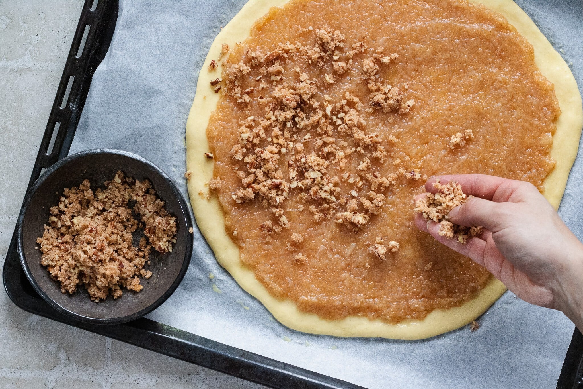- Na drobenku v misce promíchejte hrubou mouku, cukr a skořici. Přidejte máslo a prsty zpracujte. Pekanové ořechy nasekejte nadrobno a zapracujte do drobenky.