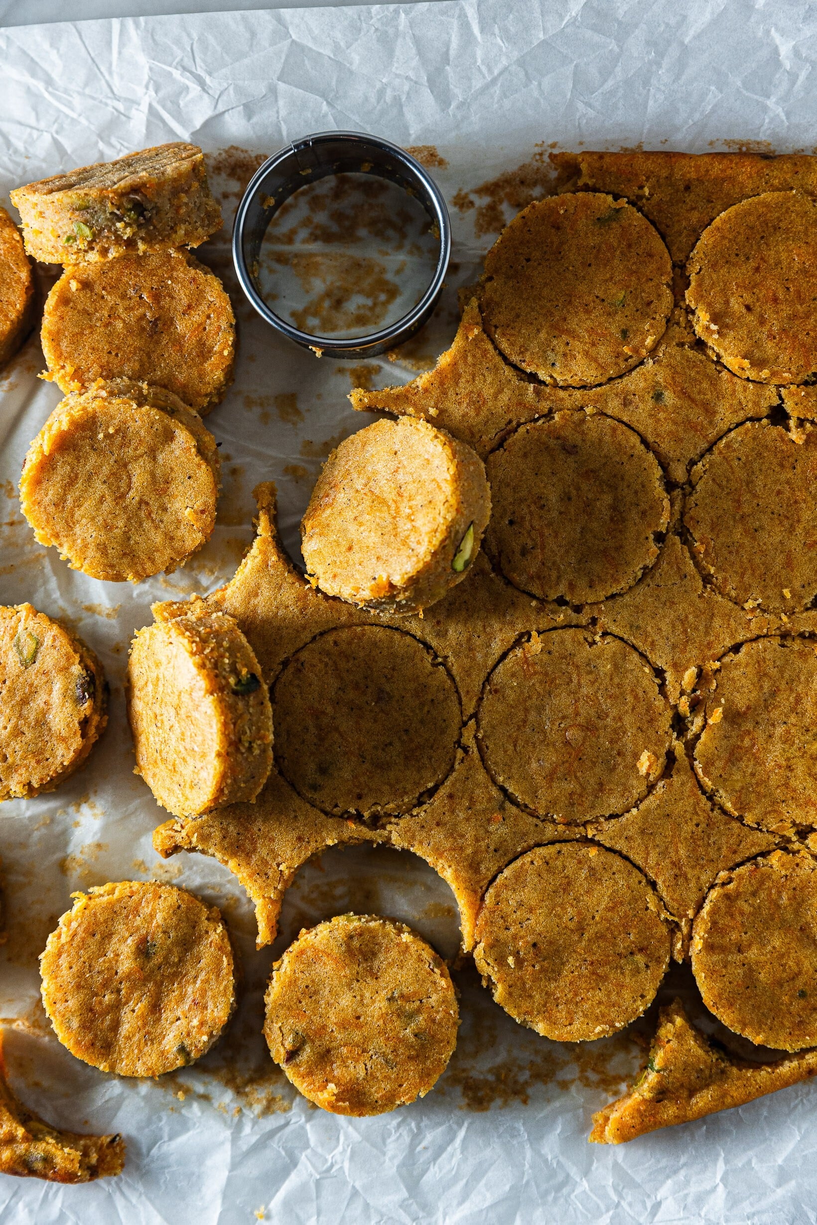 - Z vychladlého korpusu vykrájejte kolečka pomocí vykrajovátka o průměru 5,5 centimetru. Mělo by vám vyjít celkem 20 koleček.