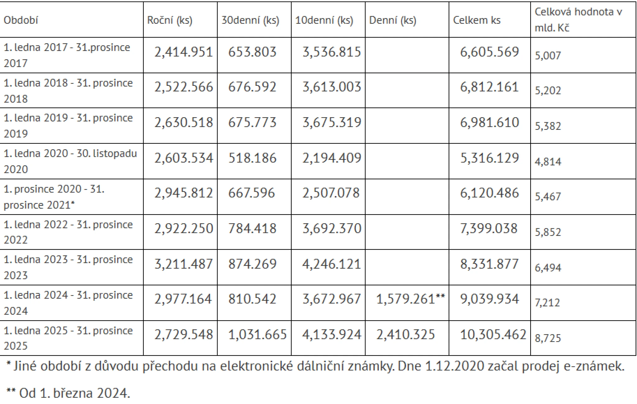 V roce 2024 se prodalo 9,04 milionu dálničních známek. V pondělí o tom informoval státní podnik Cendis, který systém elektronických dálničních známek provozuje.