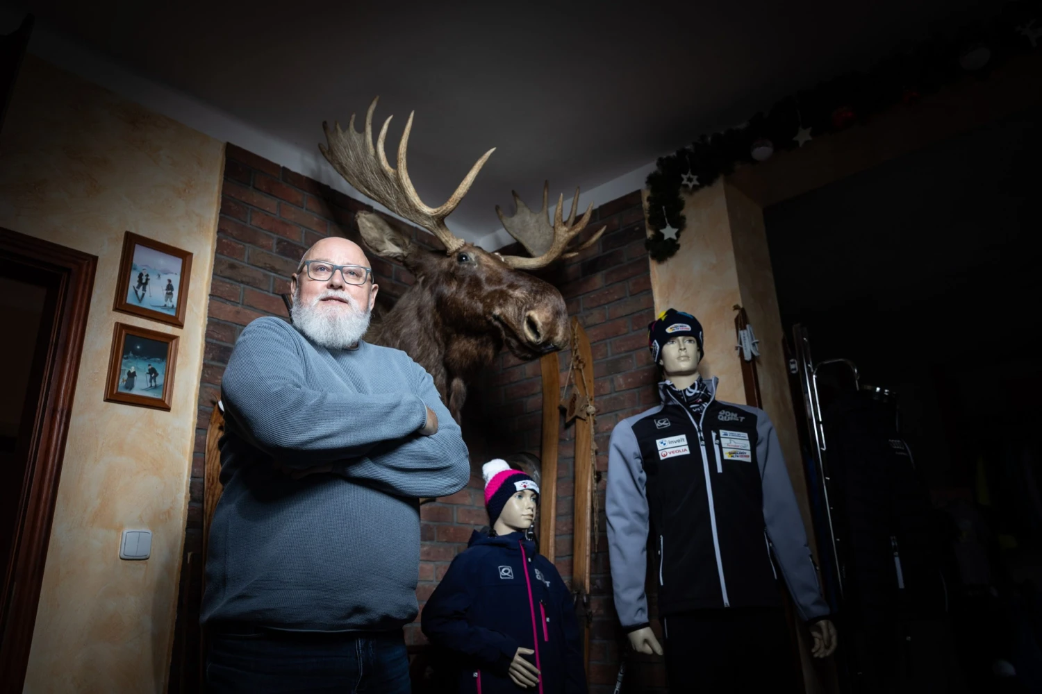V přízemí domku, v místnosti, které dominuje velká losí hlava, již si Ivo Tichý kdysi koupil od kamaráda, visí na ramínkách nespočet kombinéz různých barev a velikostí, ale i zimní bundy nebo čepice.