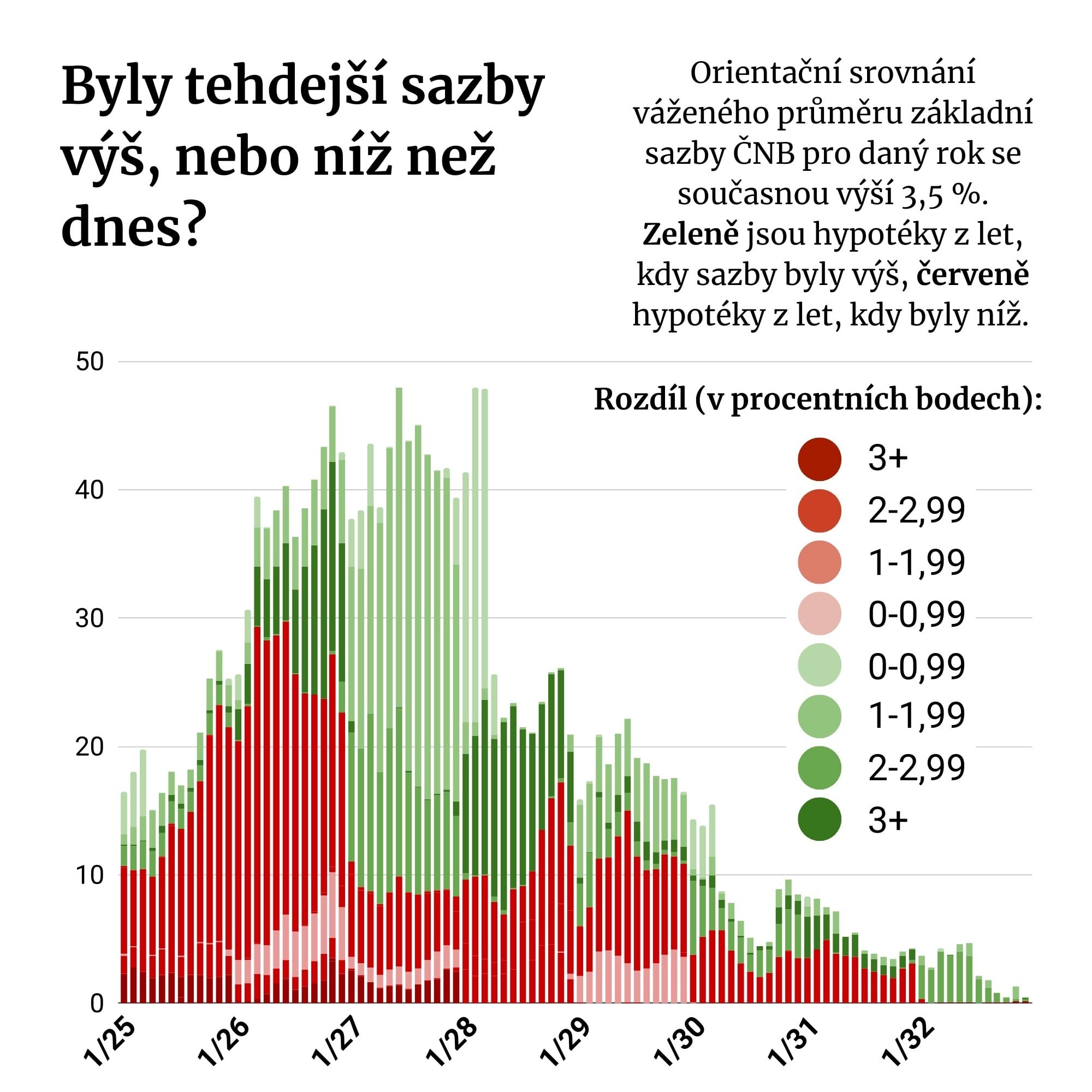 Z makroekonomického pohledu se ovšem není čeho obávat. Napřesrok se sice budou refinancovat hlavně „levné“ hypotéky z roku 2021 (vážený průměr základní sazby ČNB činil 0,89 procenta), v následujícím roce to ovšem budou zejména „drahé“ hypotéky z let 2022 (5,96 procenta) a 2024 (5,11 procenta).