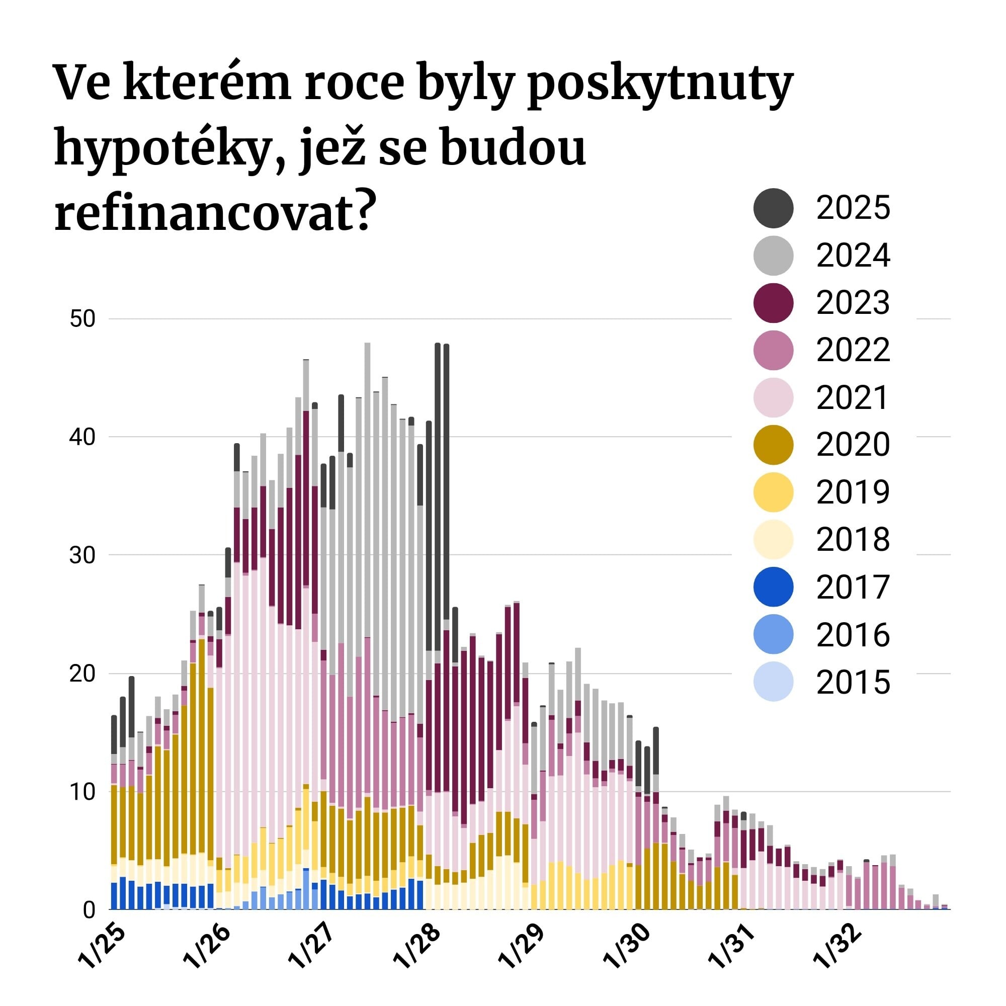Po hypoteční mánii z období pandemie totiž postupně přichází doba, kdy se tento rekordní objem úvěrů na bydlení bude refinancovat.
