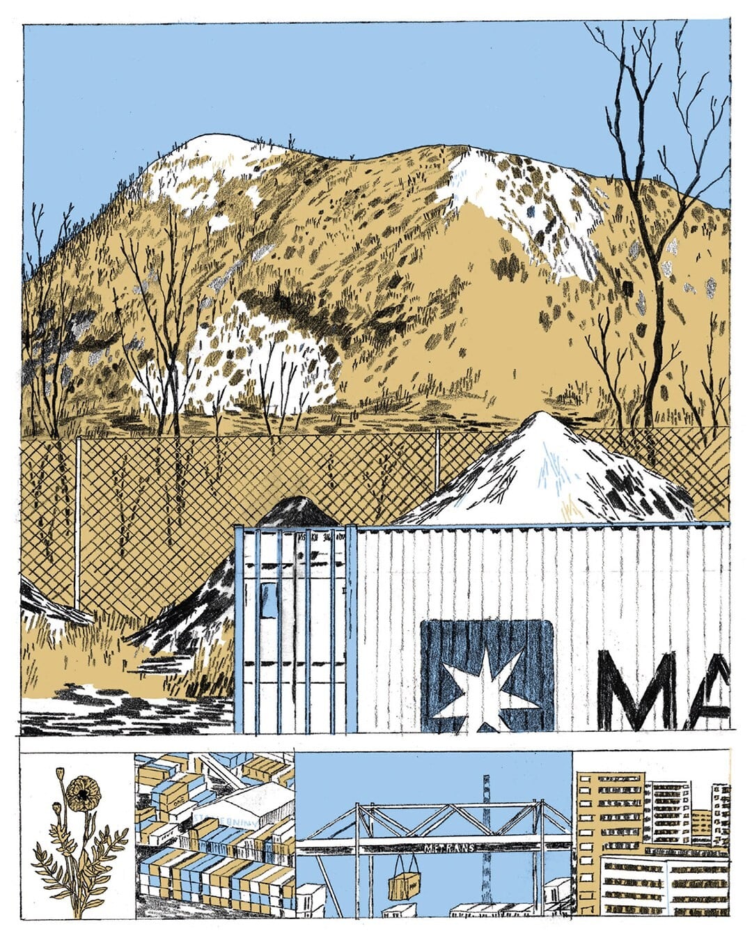 Místní jí neřeknou jinak než Kilimandžáro. „Jde o kopec vzniklý z navážky z okolních staveb a můžete odtud v přímém přenosu sledovat globalizaci, tedy pohyb na kontejnerovém překladišti Metrans,“ popisuje autor jedno ze svých nejmilejších míst v knize. Celkem jich pro projekt prošel a ilustroval téměř šedesát.